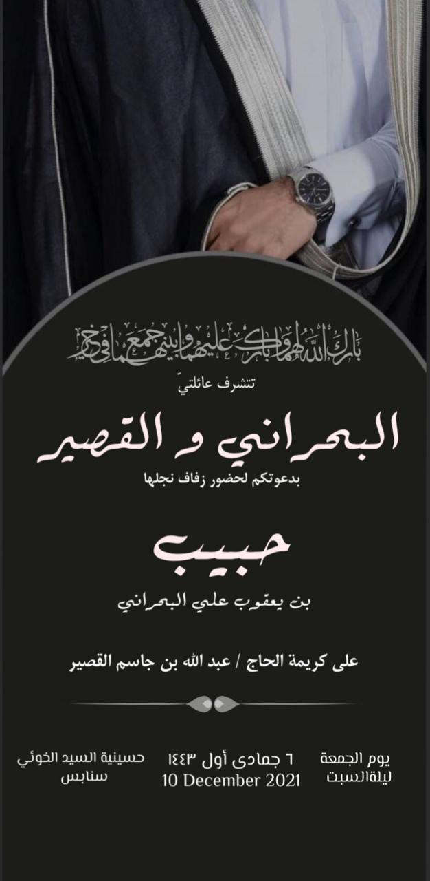 تحتفل عائلة البحراني والقصير في سنابس مساء يوم الجمعة بزفاف الشاب حبيب يعقوب علي البحراني على كريمة الحاج عبدالله جاسم القصير في حسينية السيد الخوئي بسنابس وسط فرحة الأهل والأصدقاء ومحبي العريسين.