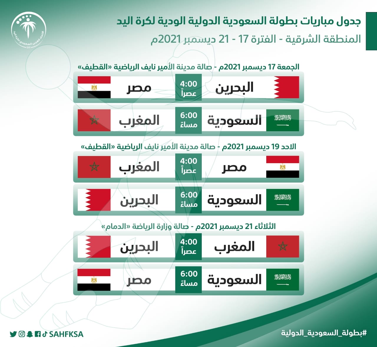 تستضيف المنطقة الشرقية خلال الفترة من 17-21 ديسمبر الجاري، منافسات البطولة الدولية الودية لكرة اليد للرجال، بمشاركة أربعة منتخبات ”السعودية، البحرين، مصر، المغرب“ تحت إشراف وتنظيم الاتحاد السعودي لكرة اليد.