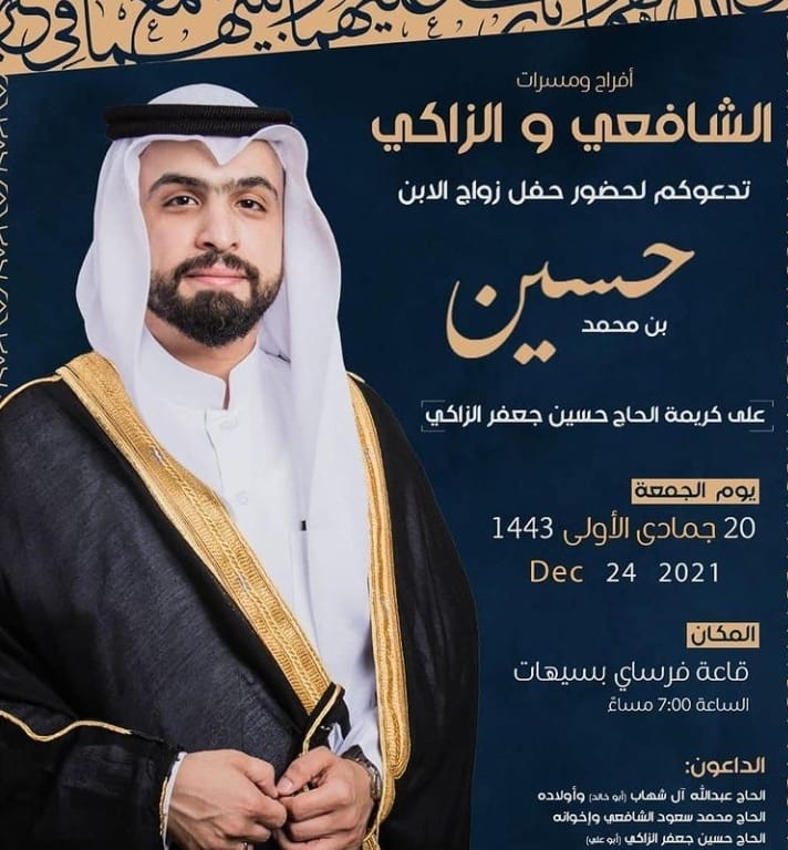 تحتفل عائلة الشافعي والزاكي في سيهات مساء يوم الجمعة بزفاف الشاب حسين محمد سعود الشافعي على كريمة الحاج حسين جعفر الزاكي «أبو علي» في قاعة فرساي بسيهات وسط فرحة الأهل والأصدقاء ومحبي العريسين.