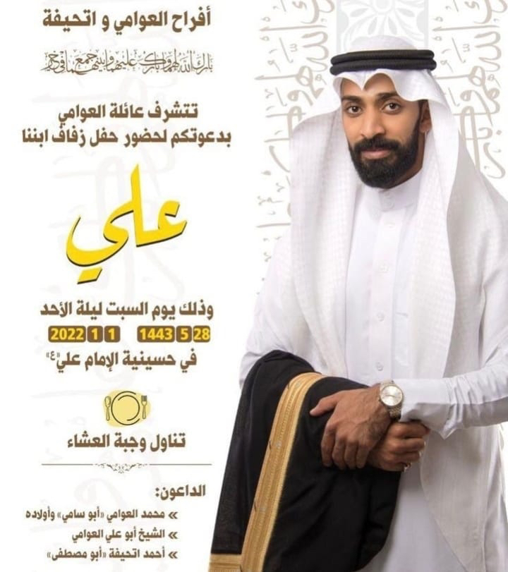 تحتفل عائلة العوامي واتحيفة في العوامية مساء يوم السبت بزفاف الشاب علي محمد العوامي على كريمة الحاج أحمد اتحيفة «أبو مصطفى» في حسينية الإمام علي وقف الحاج منصور الخنيزي بالقرب من ملاعب نادي السلام وسط فرحة الأهل والأصدقاء ومحبي العريسين.