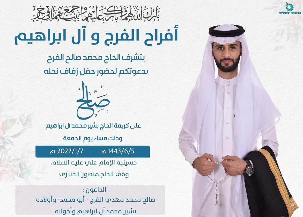 تحتفل عائلة الفرج وآل ابراهيم في العوامية مساء يوم الجمعة بزفاف الشاب صالح محمد صالح مهدي الفرج على كريمة الحاج بشير محمد آل ابراهيم في حسينية الإمام علي وقف الحاج منصور الخنيزي وسط فرحة الأهل والأصدقاء ومحبي العريسين.
