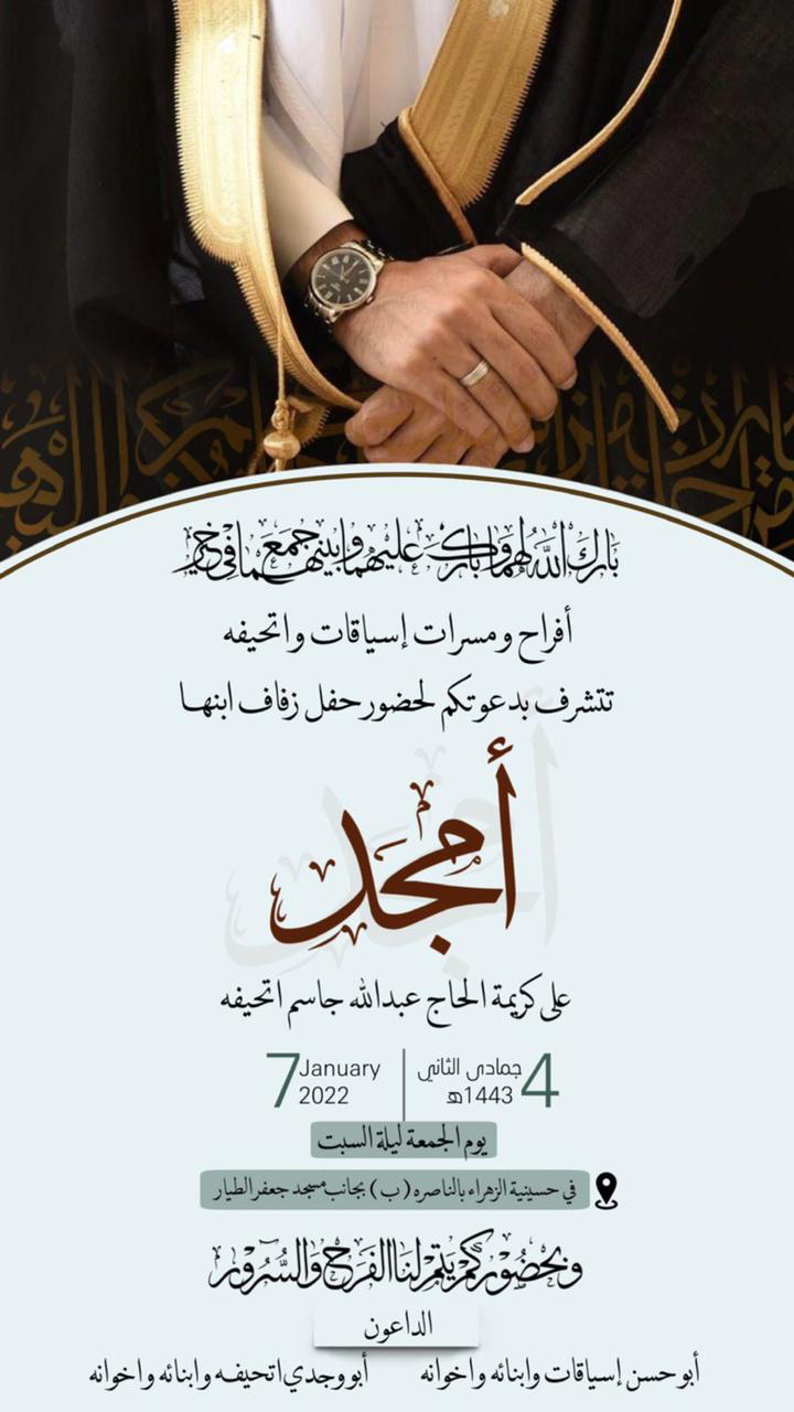 تحتفل عائلة إسياقات واتحيفة في العوامية مساء يوم الجمعة بزفاف الشاب أمجد إسياقات على كريمة الحاج عبدالله اتحيفة في حسينية الزهراء بالناصرة بجانب مسجد جعفر الطيار وسط فرحة الأهل والأصدقاء ومحبي العريسين.