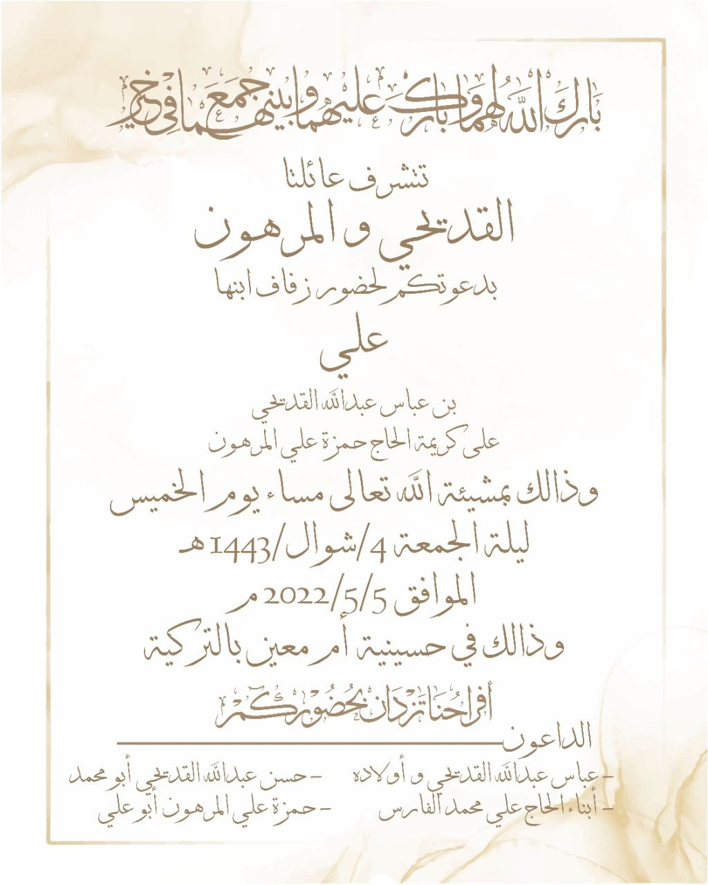 تحتفل عائلة القديحي والمرهون في تاروت مساء يوم الخميس 4 شوال بزفاف الشاب علي عباس عبدالله القديحي على كريمة الحاج حمزة علي المرهون في حسينية أم معين بالتركيا وسط فرحة الأهل والأصدقاء ومحبي العريسين.