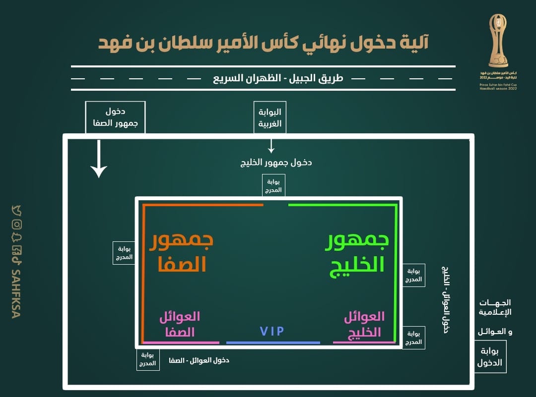 وحدد الاتحاد السعودي لكرة اليد آلية دخول الجماهير للصالة في المواجهة النهائية، حيث سيكون دخول الجماهير بالتذاكر التي ستوزعها الأندية لمدرجات الجماهير والعوائل، على أن يتم فتح البوابات قبل بداية المباراة بساعة ونصف.