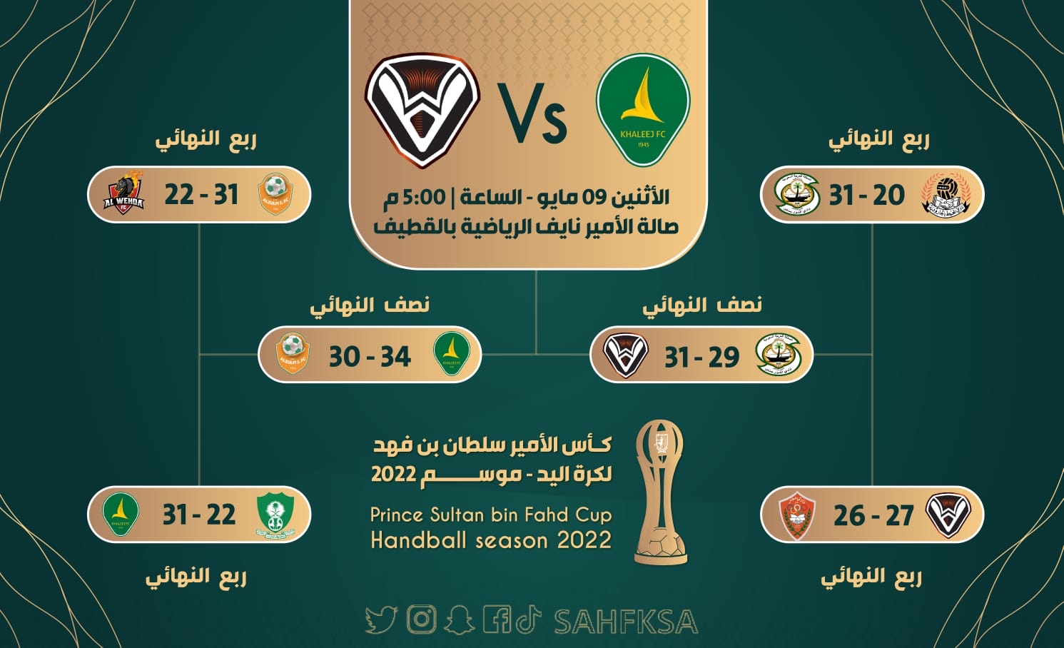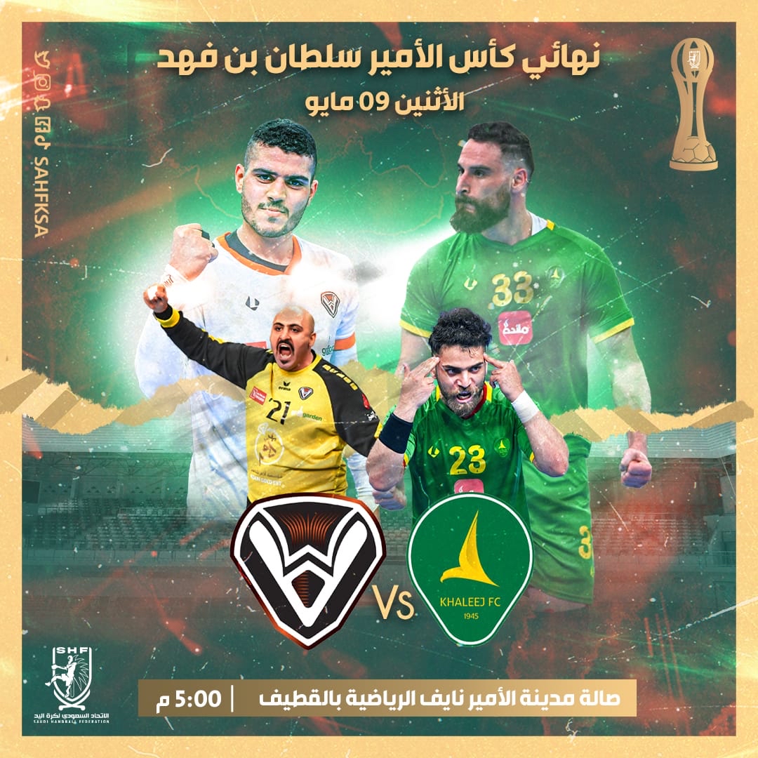 تتجه أنظار متابعي ومحبي كرة اليد يوم غدً الاثنين نحو صالة مدينة الأمير نايف بن عبد العزيز الرياضية بالقطيف، التي تحتضن المباراة النهائية على كأس الأمير سلطان بن فهد لكرة اليد للموسم الرياضي 2021-2022م في نسخته ال 44 بين فريقا الخليج والصفا، عند تمام الساعة 5:00 مساءً.