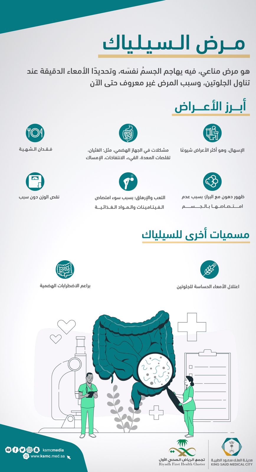 وأوضحت المدينة أن مرض السيلياك هو مرض مناعي يهاجم الأمعاء الدقيقة في الجسم، ويحدث عند تناول الجلوتين «بروتين القمح»، وحتى الآن لم يتم تحديد سبب المرض.
