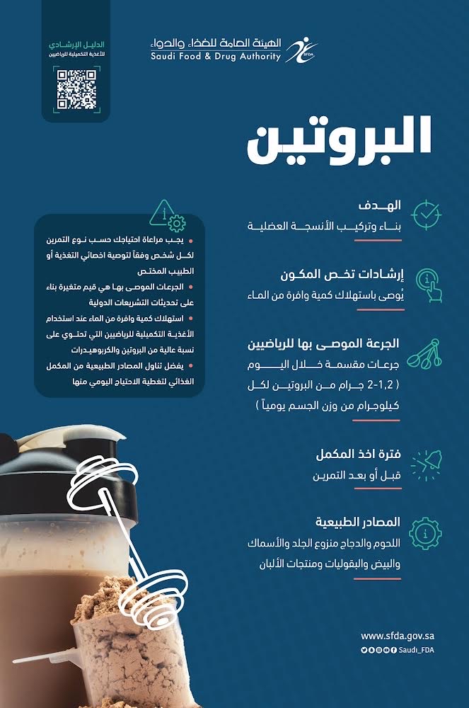 قدمت هيئة الغذاء والدواء، دليلًا إرشاديًا، للرياضيين حول تناول البروتين، والجرعات الموصى بها، والوقت الأمثل لتناوله، ومصادره الطبيعية.