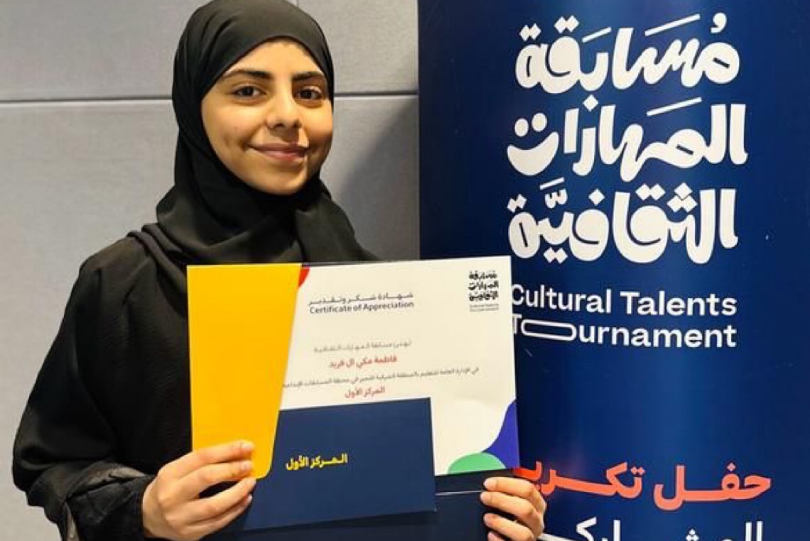 حصلت الطالبة فاطمة مكي آل فريد على المركز الأول في مسابقة المهارات الثقافية لمسار الأفلام، ضمن المسابقات الإبداعية التي أطلقتها الإدارة العامة للتعليم بالمنطقة الشرقية.