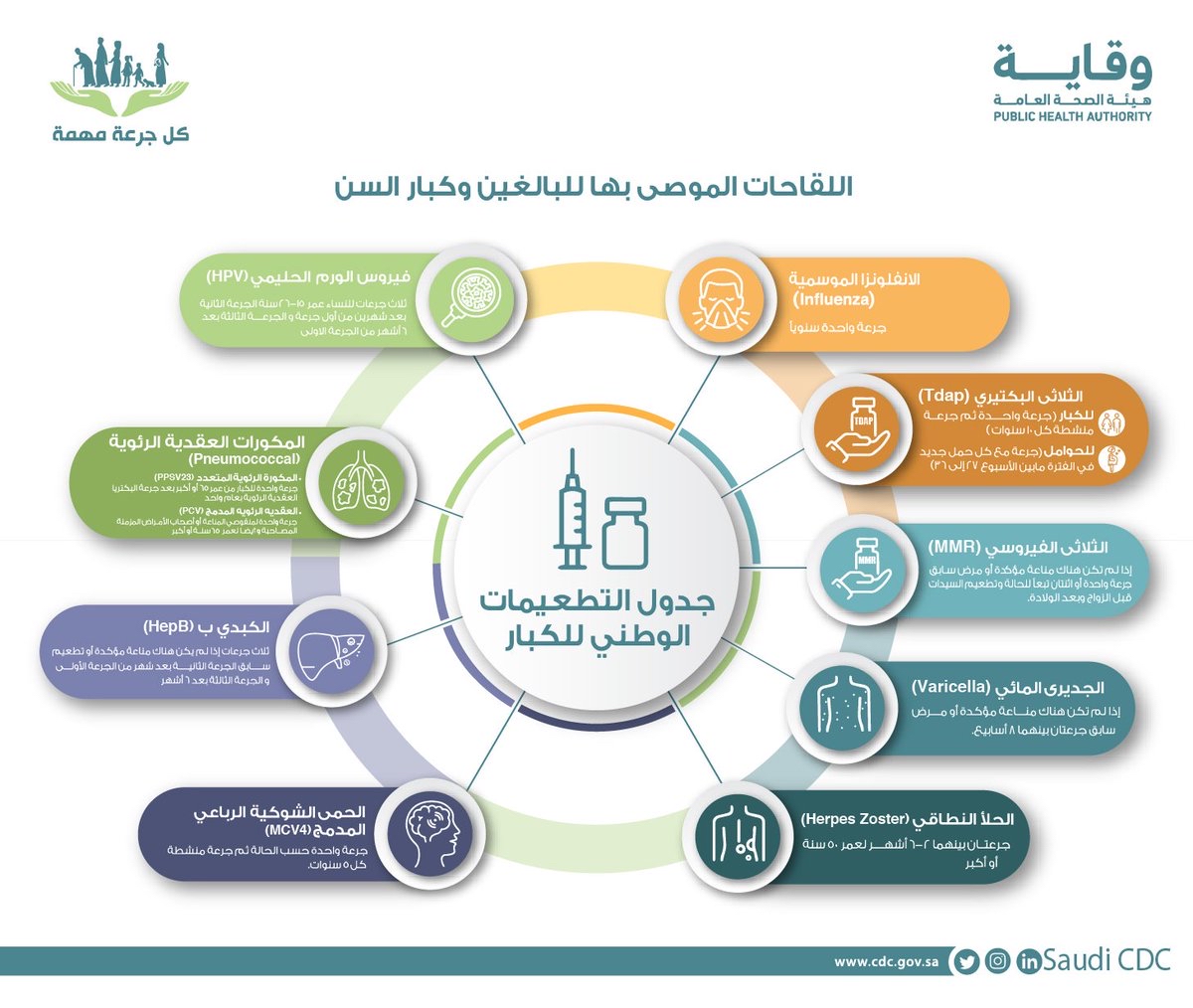 وجهت هيئة الصحة العامة ”وقاية“ نداءً إلى الأشخاص البالغين وكبار السن لأخذ اللقاحات الأساسية في الوقت المحدد للوقاية من الأمراض، حيث تشمل هذه اللقاحات لقاحات الإنفلونزا الموسمية والثلاثي البكتيري.