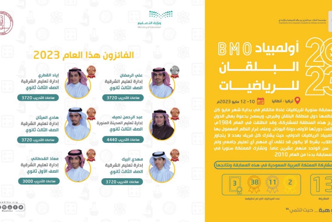 وإلى أولمبياد البلقان للرياضيات الذي أقيم بتركيا خلال الفترة 10-12 مايو 2023، حيث ظفر 6 طلاب من الوفد السعودي بميداليات فضية وبرونزية، منهم 5 طلاب من الشرقية.