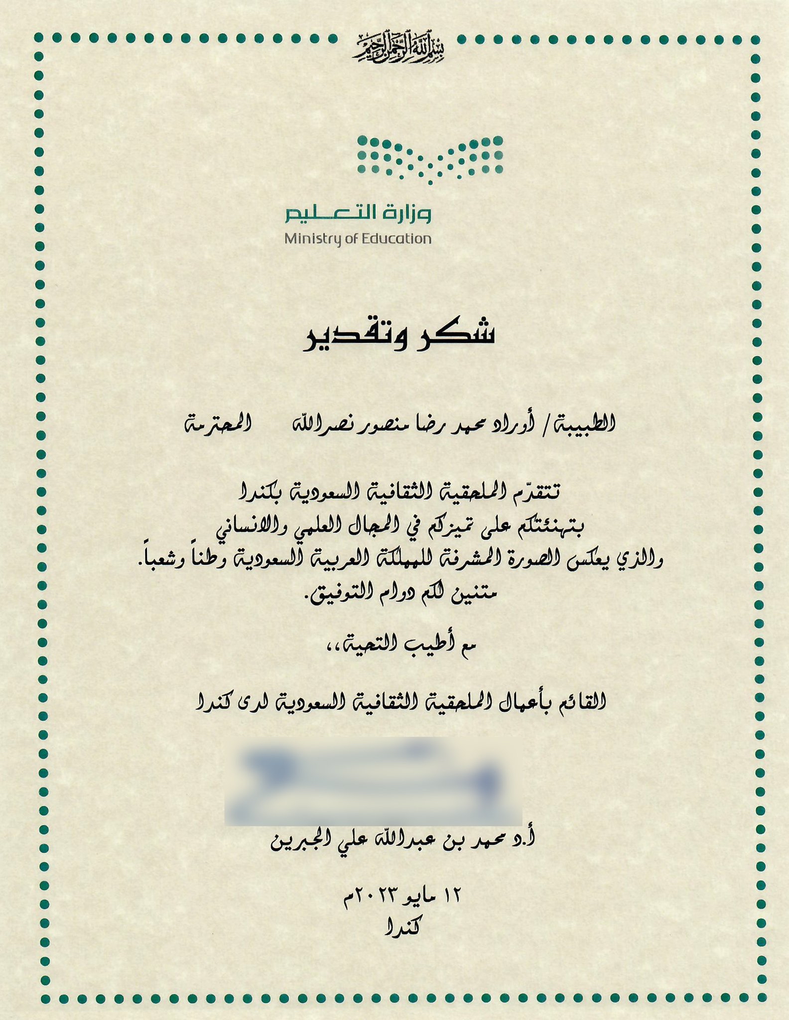 وقدمت الملحقية الثقافية السعودية في كندا شهادة تقدير للدكتورة أوراد نظير مبادرتها الإنسانية وتميزها العلمي.