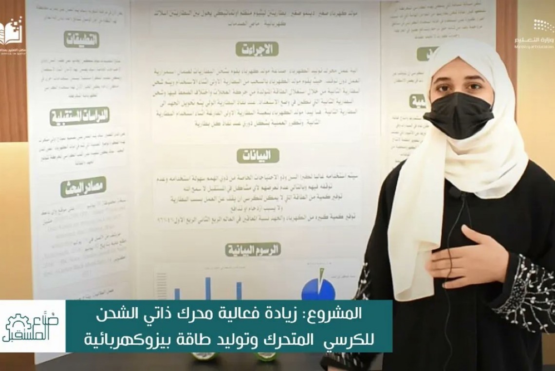 استعرضت الطالبة ”ريتاج السلمان“، من المدرسة المتوسطة الرابعة بصفوى بالقطيف، مشروعها في مجال الطاقة، تحت عنوان ”زيادة فعالية محرك ذاتي الشحن للكرسي المتحرك وتوليد طاقة بيزوكهربائية“.