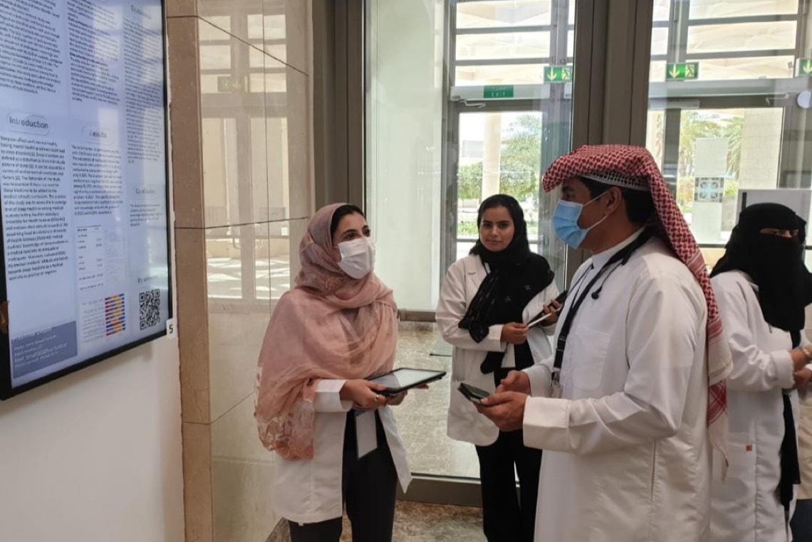 يقيّم أستاذ الطب في جامعة الملك سعود بن عبد العزيز للعلوم الصحية د. وسيم الطلالوه، الأبحاث، في يوم البحث السنوي بنسخته الثانية.