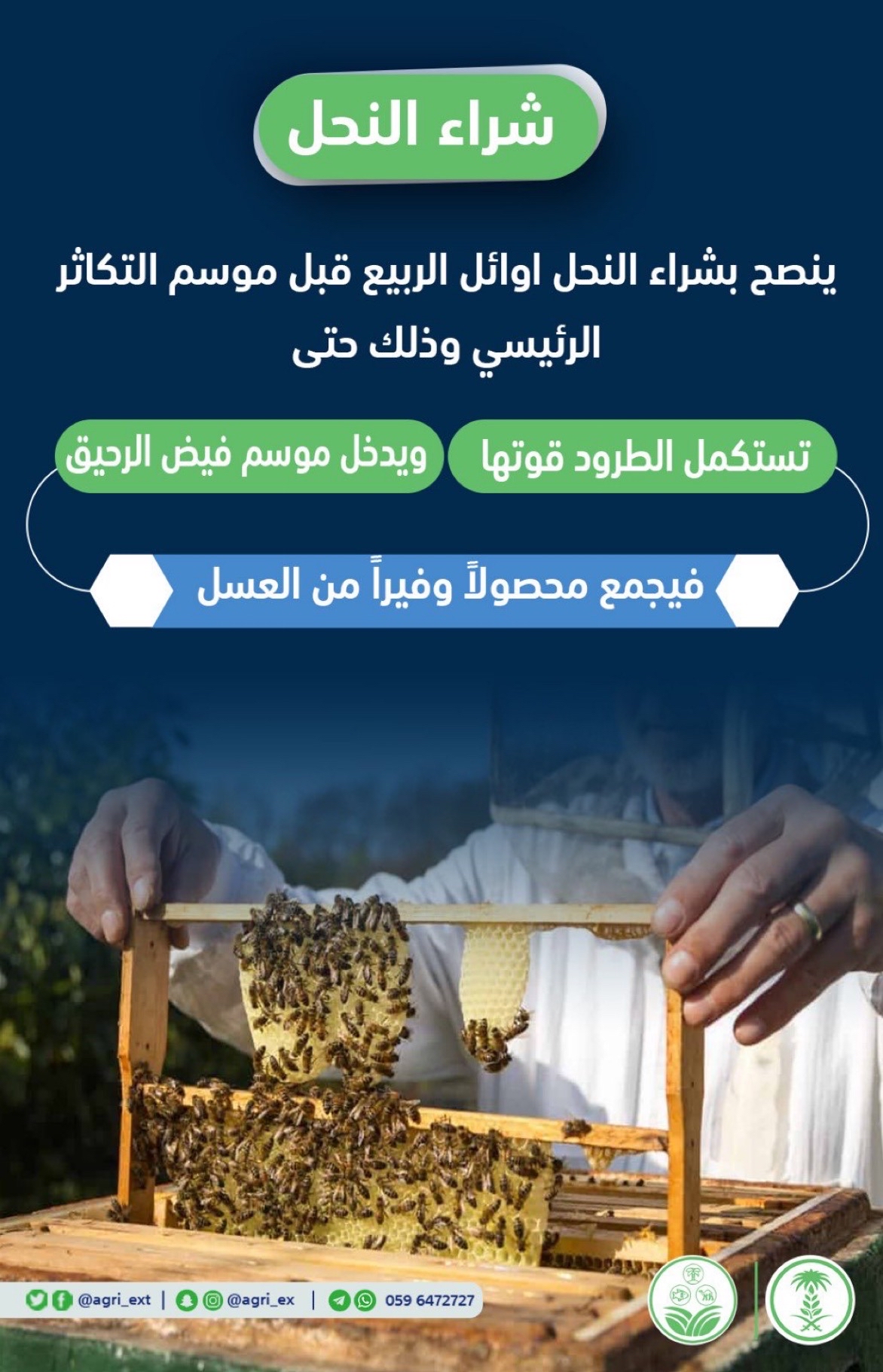 ونصح بشراء النحل في أوائل فصل الربيع قبل موسم التكاثر الرئيسي، وذلك حتى تستكمل الطرود قوتها، ويدخل موسم فيض الرحيق، ما يؤدي إلى جمع محصول وفير من العسل.