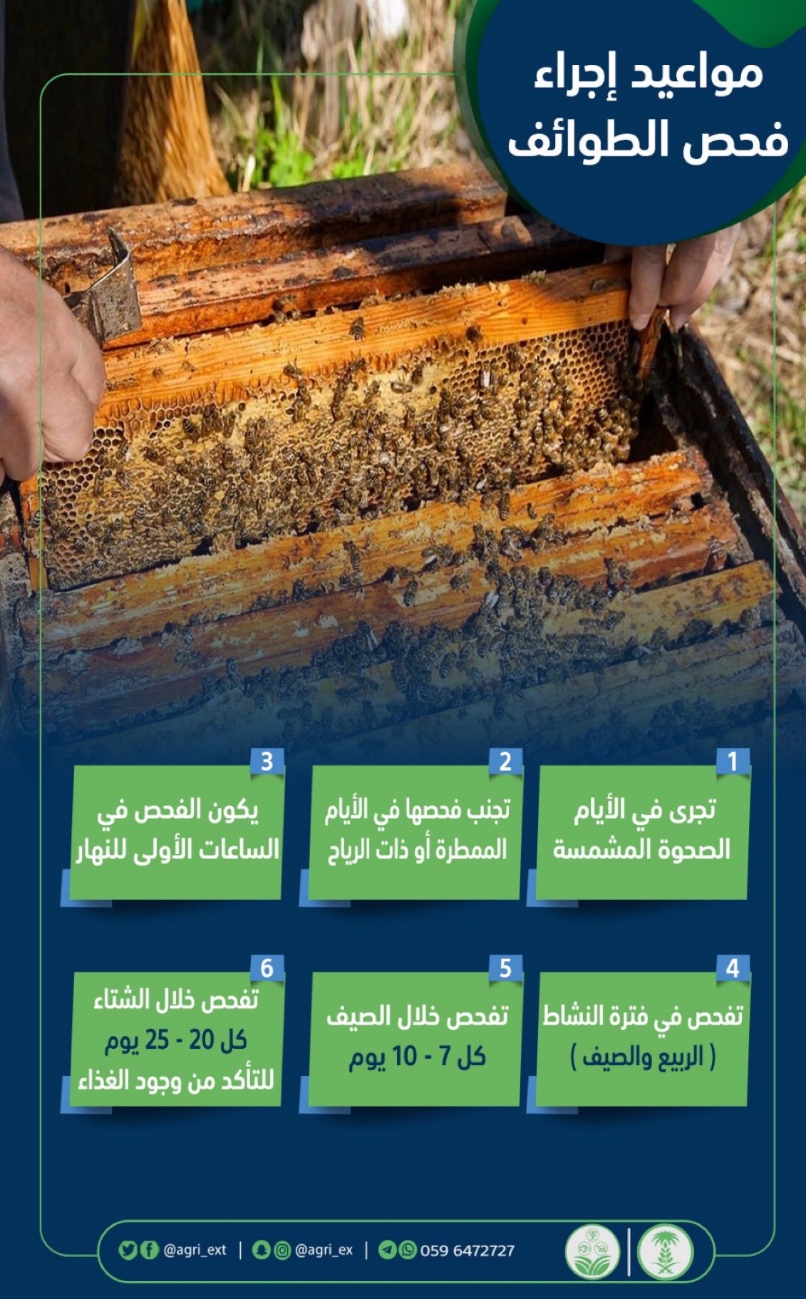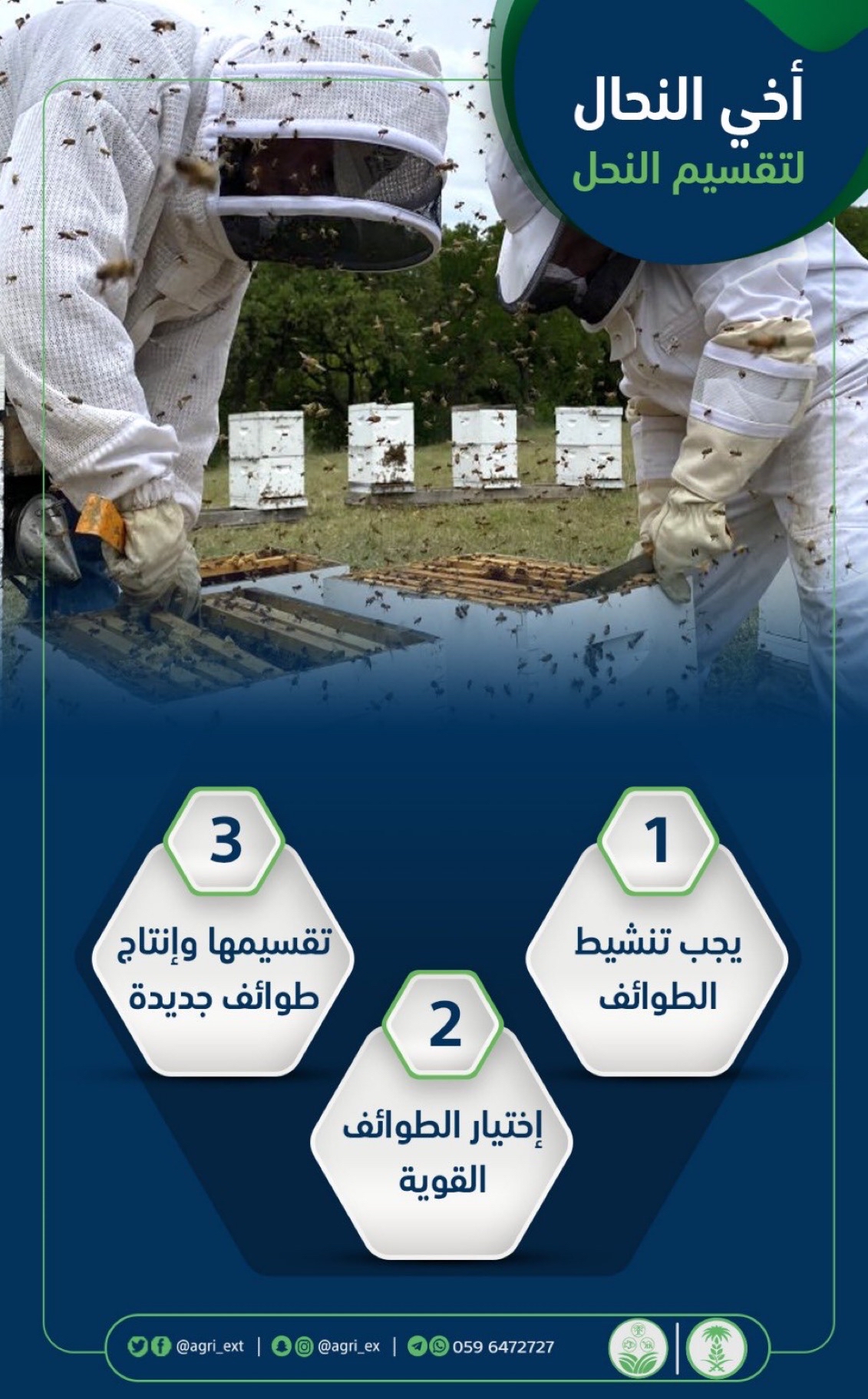 ونوه بضرورة التأكد من غذاء النحل «عسل وحبوب لقاح»، وإضافة أقراص أو أساسات شمعية جديدة، ورفع الأقراص الزائدة عن الحاجة، مع تنظيف قاعدة الخلية، وترتيب وضع الأقراص.