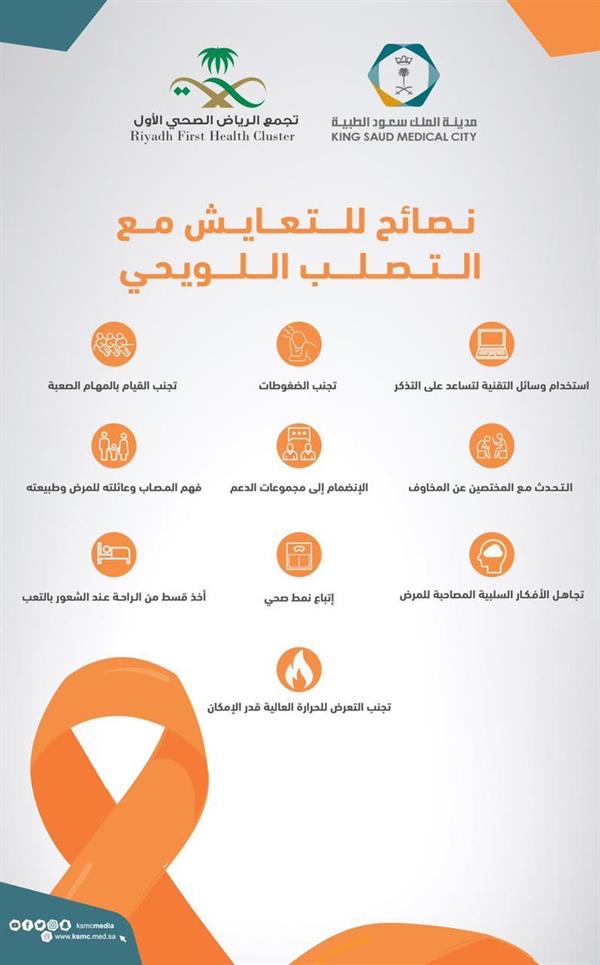 قدّمت مدينة الملك سعود الطبية مجموعة من النصائح الطبية للمصابين بمرض التصلب اللويحي وذويهم للتعايش مع المرض، منها تجنب التعرض للحرارة العالية قدر الإمكان.