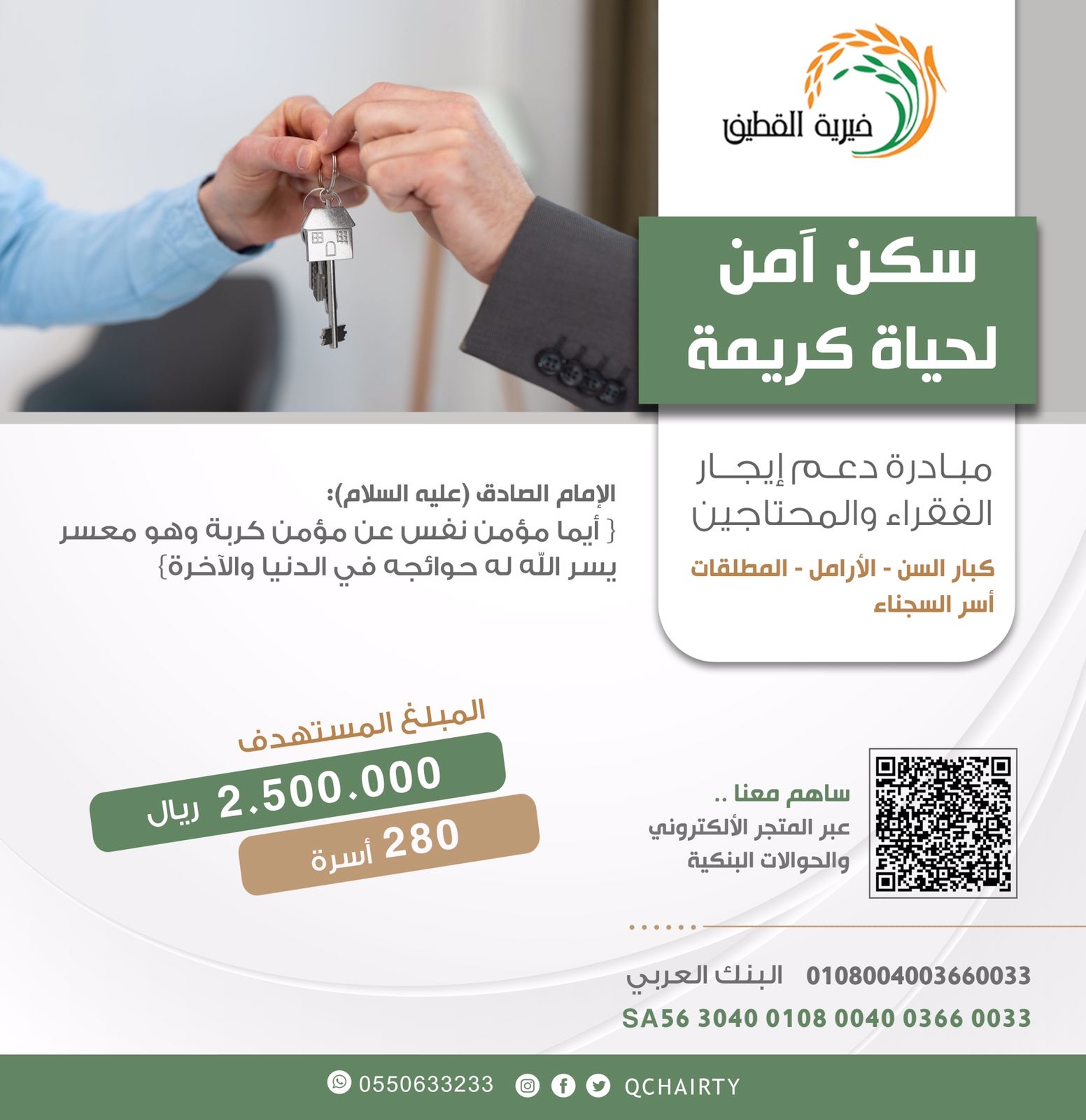 أطلقت جمعية القطيف الخيرية مبادرة ”سكن آمن لحياة كريمة“؛ اليوم الجمعة، وذلك لدعم سداد إيجارات 280 مستفيدا من الأسر المحتاجة، وتستهدف جمع مبلغ 2500000 ريال.