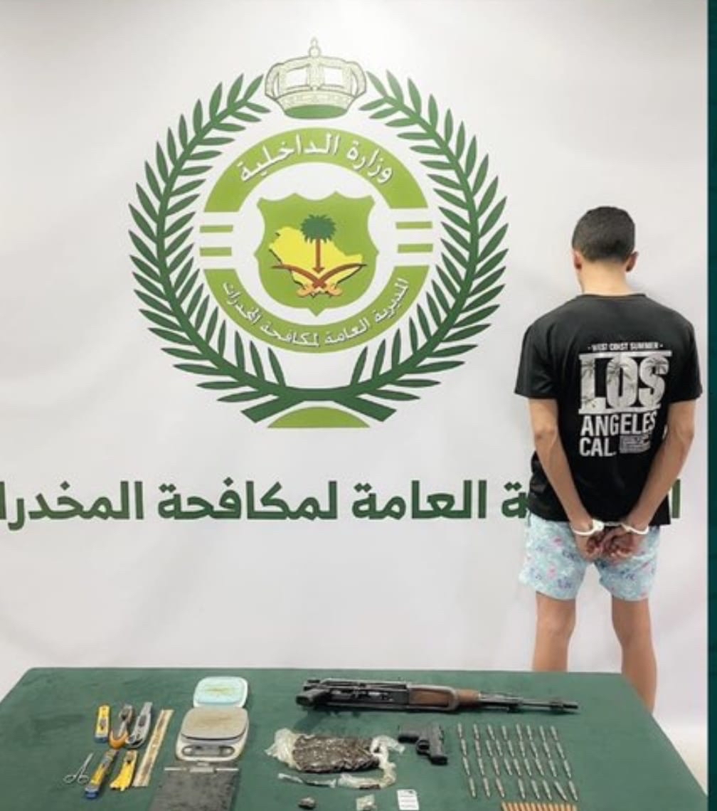 وضبط بحوزته أسلحة نارية وذخيرة حية، وتم إيقافه، واتخاذ الإجراءات النظامية بحقه، وإحالته إلى النيابة العامة.