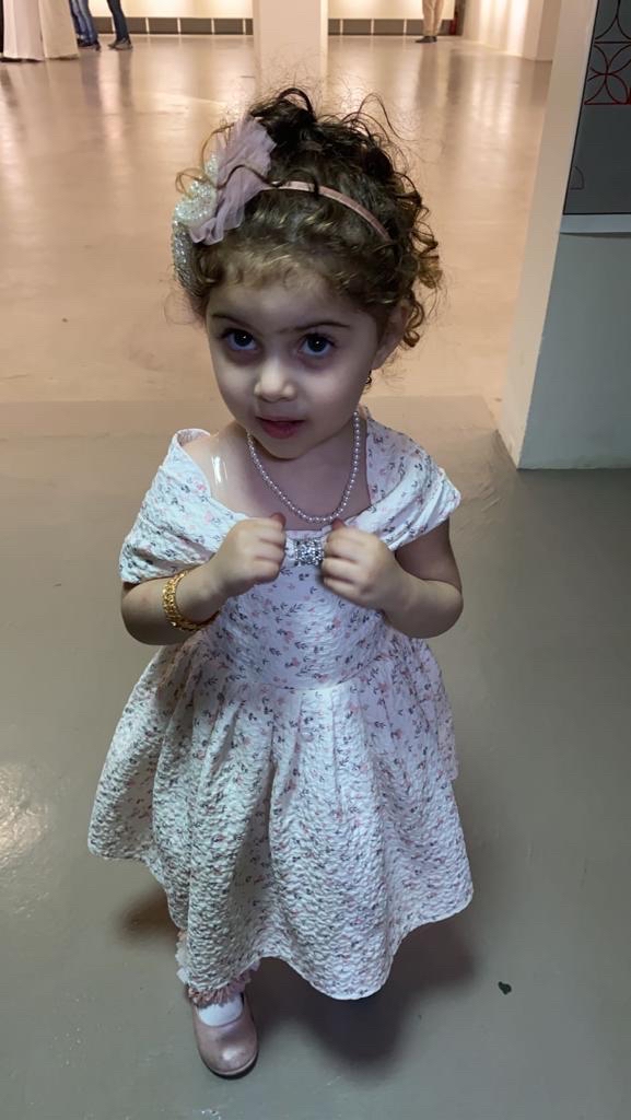 وشاركت ابنتها ياقوت بعمر سنتين بلوحة كانفس وهي عبارة عن خطوط متداخلة، بالألوان المائية.