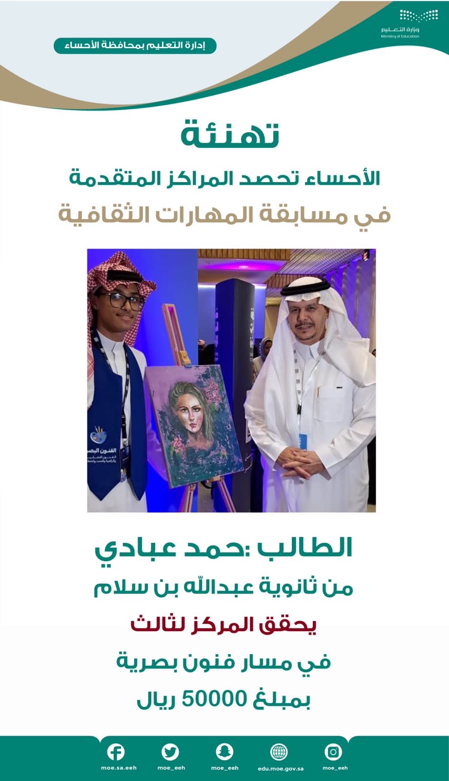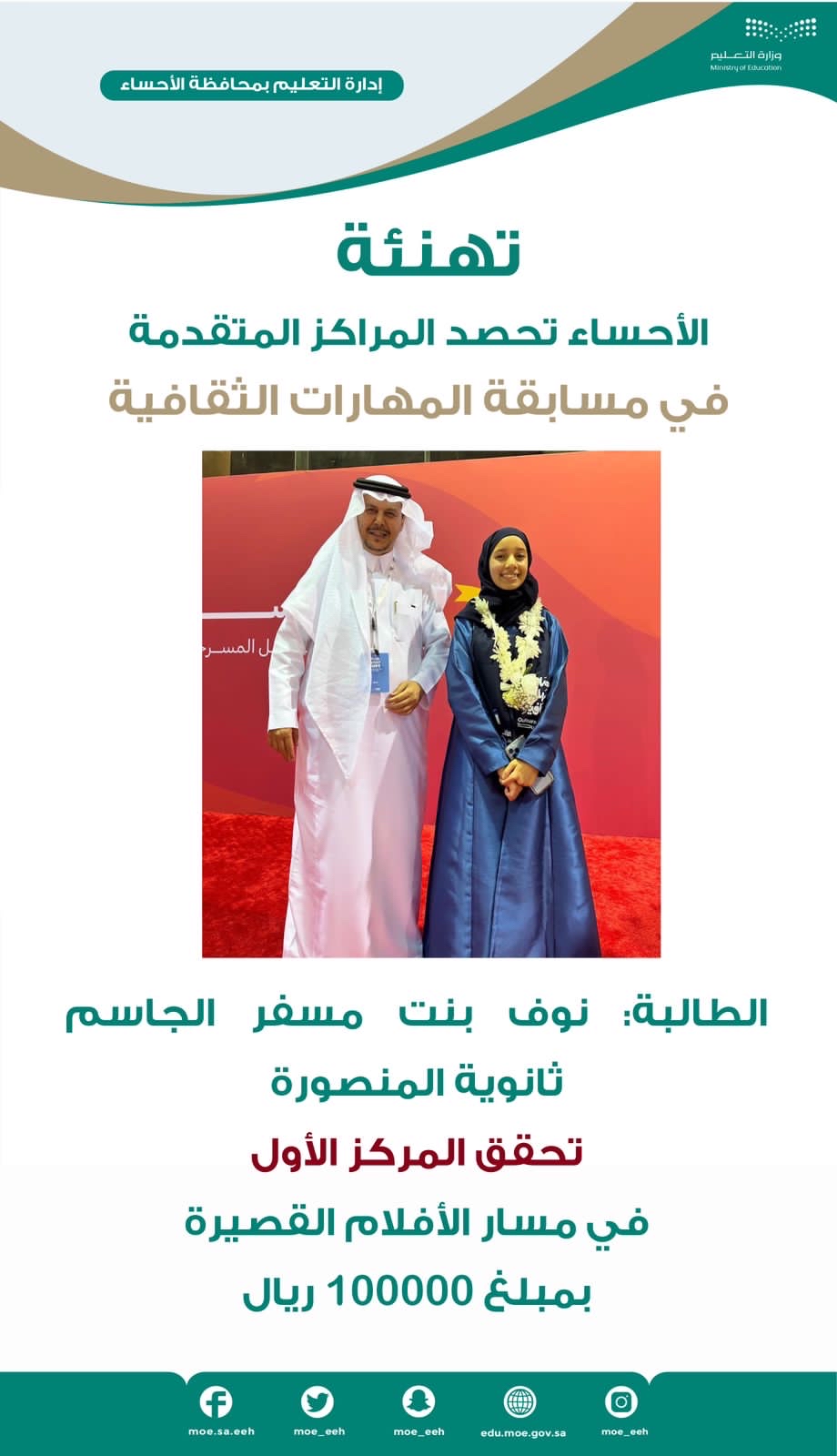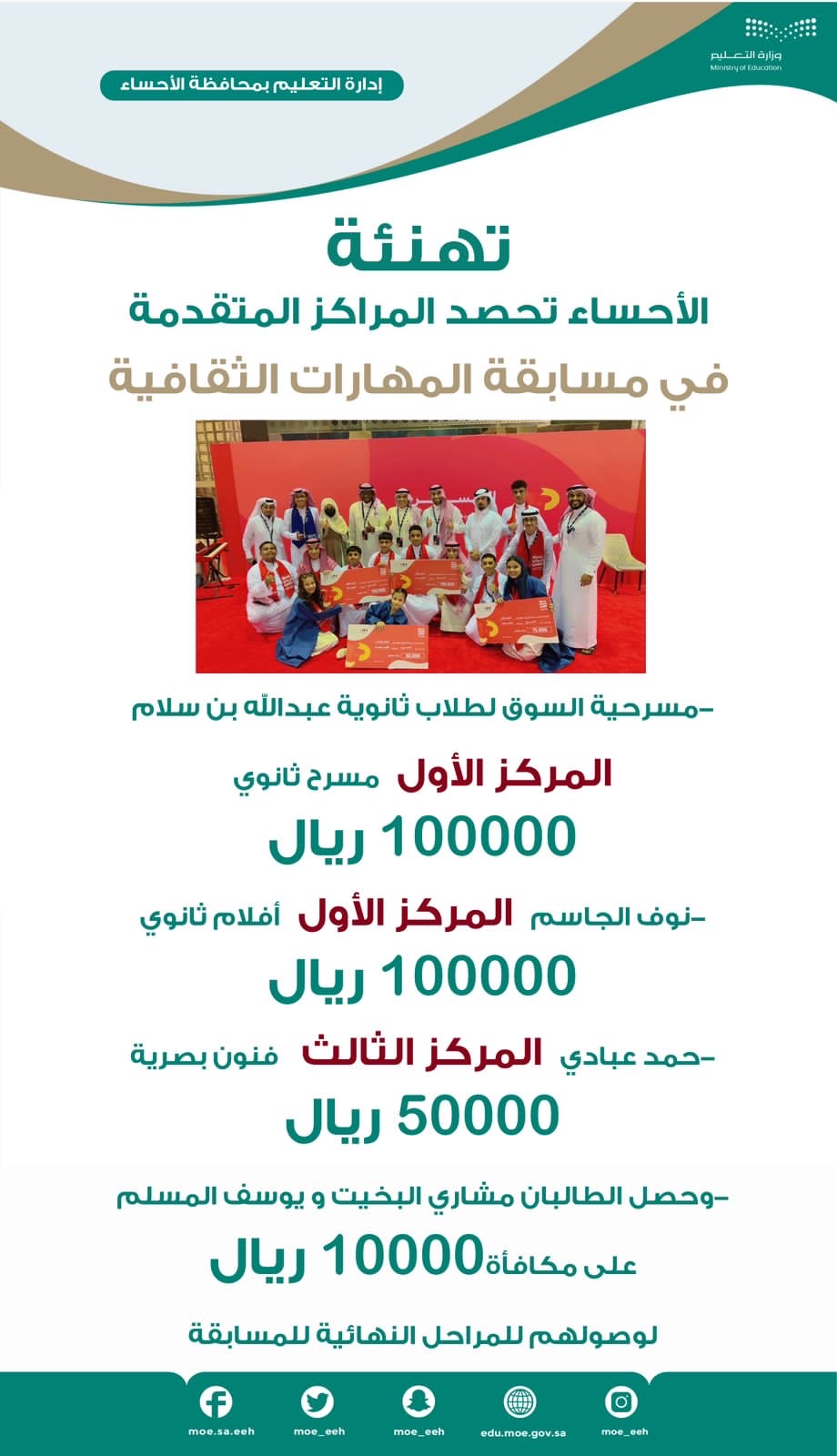 وقد هنأ مدير عام تعليم الأحساء حمد العيسى الفائزين، مُعبّرًا عن فخره بإنجازاتهم المذهلة. كما وجّه التهنئة لمنسقة مسابقة المهارات الثقافية، د. نوره الملحم، لحصولها على لقب فئة المنسقة المتميزة.