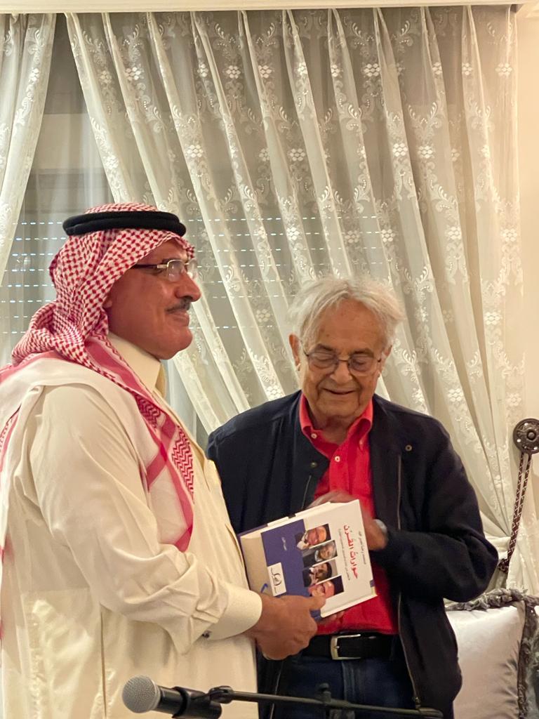 ولقائه بابنتيه أرواد ورهام ملاطفا له بالترحيب بأرواد التي كانت بمعية والدها في رحلته للسعودية وأسم ابنته اوراد حيث أشاد الأستاذ نصر الله بعمق العلاقة المتجذرة التي جمعتهما والتي أشار لها أدونيس في طيات الحديث قائلا ها أنا أعود من داري لداري الذي يقلني بين هؤلاء المثقفين والشعراء الذين يرشون ابتسامة الفرح.