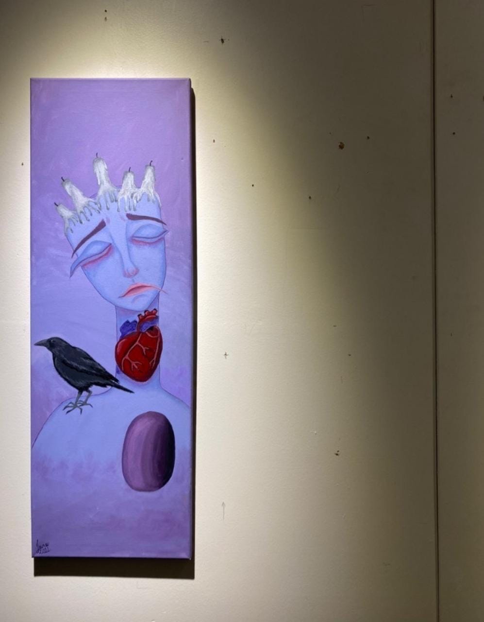 وبيّنت أنها تعبر عن الفجوة الموجودة في الصدر نتيجة كتمان المشاعر السلبية، كما يفسرها المجتمع بأنه متبلد المشاعر، ووجود الغراب يعبر عن البؤس والتشاؤم المصاحب لمشاعر هذا الإنسان، والشموع المطفأة تدل على موت شغفه وحبه للحياة.