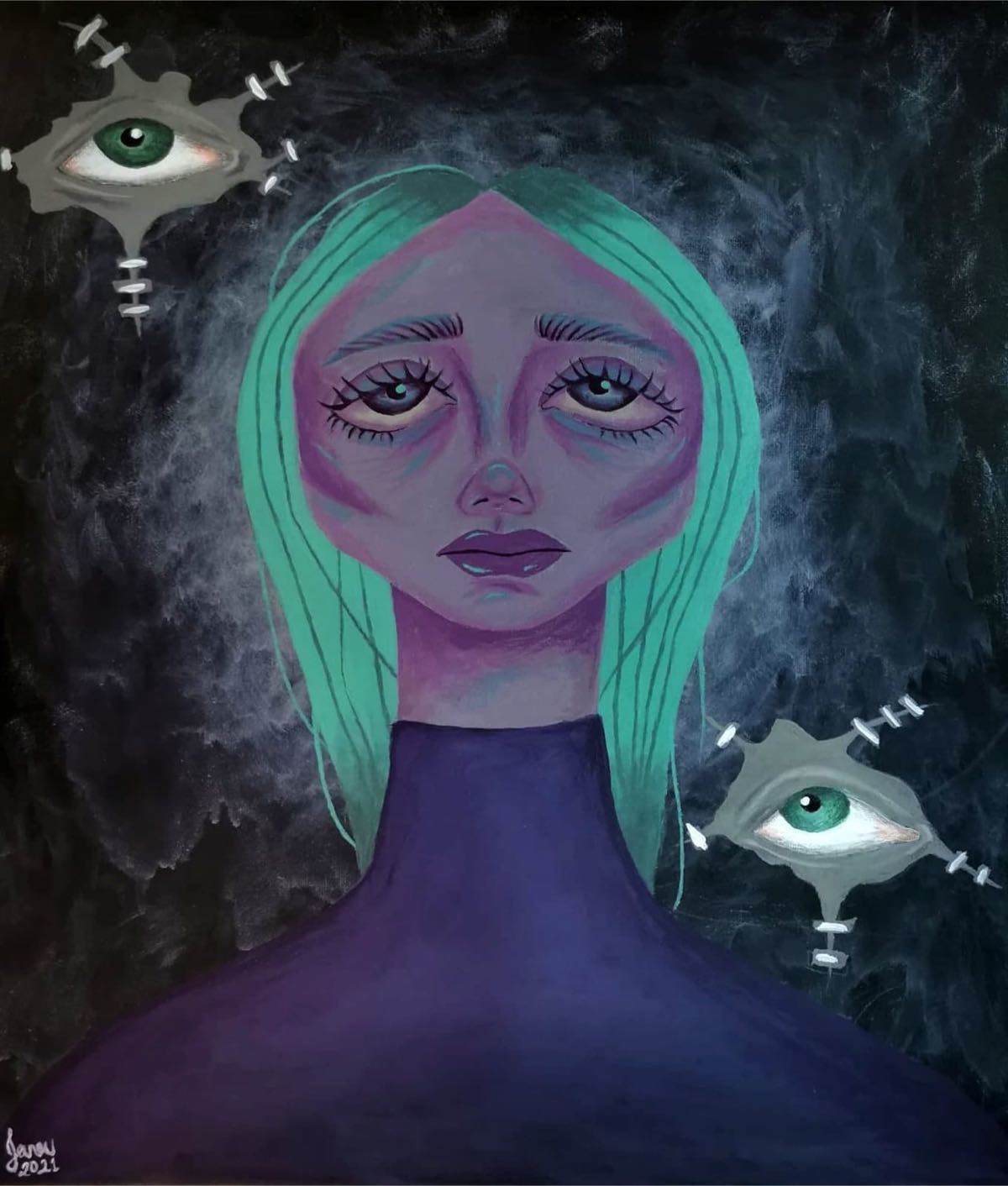وعن لوحتها الأولى بعنوان ”Stop Staring.. توقفوا عن التحديق!“، بينت أنها من الإكريليك على لوحة كانفس بحجم 40×50 سم، وتعبر عن حالة سائدة في المجتمع، وهي التحديق بالآخرين والحكم عليهم من مظهرهم، ما يضر بالصحة النفسية والاجتماعية للفرد.