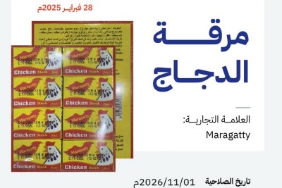 حذرت الهيئة العامة للغذاء والدواء المستهلكين من منتج مرقة الدجاج الذي يحمل العلامة التجارية ”Maragatty“، وطالبتهم بالتخلص الفوري مما لديهم من هذا المنتج، حفاظًا على صحتهم. وأكدت الهيئة أنها بادرت بسحب المنتج من الأسواق، كإجراء احترازي، نظرًا لمخالفته للوائح. يأتي هذا التحذير بعد أن كشفت التحاليل - التي لم يُفصح عن طبيعتها بالتحديد في البيان - مخالفة المنتج المذكور، والذي يُعبأ في عبوات تزن 480 جرامًا، ويتم استيراده من جمهورية مصر...