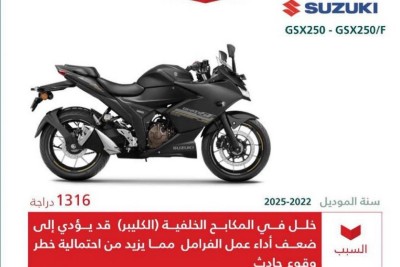 أعلنت وزارة التجارة عن استدعاء 1,316 دراجة نارية من طراز ”سوزوكي GSX250“ و”GSX250/F“، والتي تشمل الموديلات المصنعة بين عامي 2022 و 2025. في إجراء عاجل يهدف إلى ضمان سلامة قائدي الدراجات النارية. ويأتي هذا التحرك على خلفية اكتشاف خلل في المكابح الخلفية قد يؤدي إلى عواقب وخيمة. وأوضحت الوزارة في بيانها أن الخلل يكمن تحديداً في ”الكليبر“ الخاص بالمكابح الخلفية، مما قد يتسبب في ضعف ملحوظ في أداء الفرامل أثناء القيادة. وشددت... |