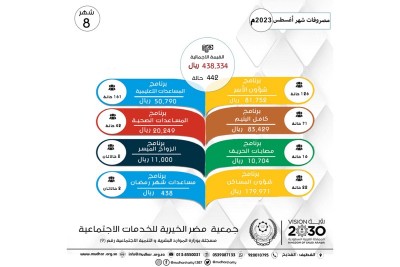 بلغت مصروفات جمعية مضر الخيرية، على البرامج التنموية والخدمية في شهر أغسطس الماضي، 438 ألفًا و334 ريالًا، استفادت منها 442 حالة، وذلك بحسب التقرير المالي الشهري الصادر عن الادارة المالية في الجمعية. وتصدر التقرير برنامج شؤون المساكن بمبلغ 179 ألف و971 ريالاً، وبنسبة 41% صرفت على 22 حالات. وتكفل برنامج المساعدات التعليمية بالمصاريف الدراسية لـ 161 طالبًا وطالبة، بمبلغ 50,790 ريال، بنسبة 12% من اجمالي مصروفات الجمعية على البرامج. وأنفق على برنامج شؤون... |