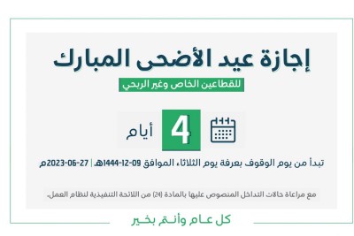 الموارد البشرية: إجازة عيد الأضحى للقطاعين الخاص وغير الربحي 4 أيام تبدأ من الثلاثاء 27 يونيو