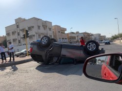 بالصور.. انقلاب سيارة في حادث مرّوع وسط مدينة القطيف