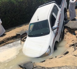 بالصور.. هبوط أرضي يبتلع سيارة في تاروت
