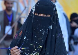 تشكيلية بـ ”عباءة الرأس“ تبهر زوار ”جدارية الوطن“ برسوماتها