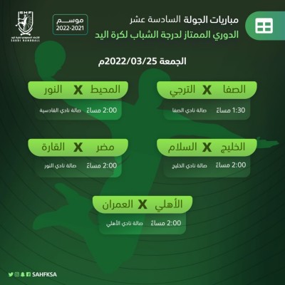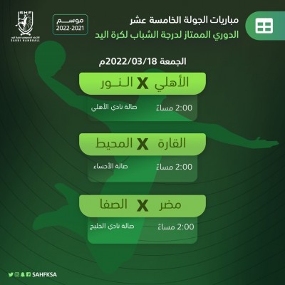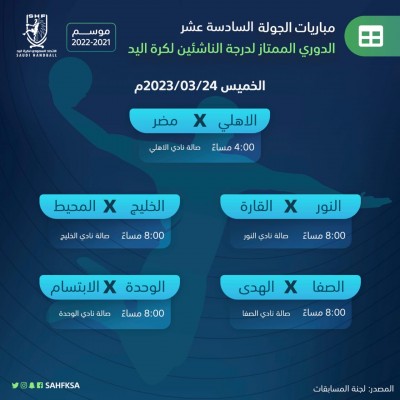 تتواصل يوم غدًا الخميس، منافسات بطولة الدوري الممتاز لكرة اليد لدرجة الناشئين، بإقامة خمس مباريات، ضمن الجولة السادسة عشر، والتي قد تشهد ضمان فريق النور رسمياً تحقيق لقب البطولة للموسم الرياضي الحالي 2021-2022م قبل ختام المسابقة بجولتين، وذلك في حال تحقيقه الفوز أو التعادل في مباراته أمام القارة. وستبدأ أولى مباريات الجولة عند الساعة 4:00 عصراً بمواجهة الأهلي مع مضر على صالة نادي الأهلي بجدة، وستكون باقي المباريات الأربع عند الساعة ... |
