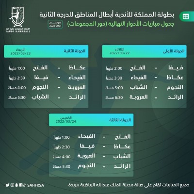 حددت اللجنة الفنية للمسابقات والبطولات في الاتحاد السعودي لكرة اليد، مواعيد وأماكن إقامة الأدوار النهائية من بطولات المملكة لكرة اليد للأندية أبطال المناطق لفئات الناشئين والشباب والأولى، بمشاركة 8 أندية في كل بطولة. إذا ستبدأ البطولات الثلاث بإقامة بطولة المملكة لدرجة الناشئين والمؤهلة للدوري الممتاز، خلال الفترة من 15 حتى 19 مارس 2022م، على صالة نادي الحزم بالرس، بمشاركة أندية: «الحزم - الهلال - الترجي - القادسية - العمران - عرعر ... |