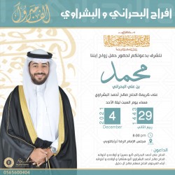 احتفلت عائلة البيابي والسبع في تاروت مساء يوم الإثنين بزفاف الشاب سجاد عبد الكريم البيابي على كريمة الحاج هاني منصور السبع «أبو منصور» فرحة الأهل والأصدقاء ومحبي العريسين. وعبر العريس عن سعادته الغامرة بدخوله القفص الذهبي، سائلا الله أن يوفقه وعروسه ويرزقهما الذرية الصالحة. أسرة ”جهينة الإخبارية“ تهنئ العريسين وعائلتيهما وتسأل الله ان يبارك لهما، متمنين لهما حياة سعيدة ‏ ...