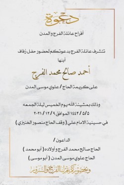تحتفل عائلة الفرج والمدن في العوامية مساء يوم الخميس بزفاف الشاب أحمد صالح محمد الفرج على كريمة الحاج علوي موسى المدن «أبو موسى» في حسينية الإمام علي - وقف الحاج منصور الخنيزي وسط فرحة الأهل والأصدقاء ومحبي العريسين. وعبر العريس عن سعادته الغامرة بدخوله القفص الذهبي، سائلا الله أن يوفقه وعروسه ويرزقهما الذرية الصالحة. أسرة ”جهينة الإخبارية“ تهنئ العريسين وعائلتيهما وتسأل الله ان يبارك لهما، متمنين لهما حياة سعيدة ‏ ...