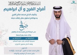 تحتفل عائلة الفرج في العوامية مساء يوم الخميس بزفاف الشاب عبدالله محمد علي أحمد الفرج على كريمة الحاج نصر سلمان صالح الفرج في حسينية الإمام علي وقف الحاج منصور الخنيزي بالقرب من ملاعب نادي السلام وسط فرحة الأهل والأصدقاء ومحبي العريسين. وعبر العريس عن سعادته الغامرة بدخوله القفص الذهبي، سائلا الله أن يوفقه وعروسه ويرزقهما الذرية الصالحة. أسرة ”جهينة الإخبارية“ تهنئ العريسين وعائلتيهما وتسأل الله ان يبارك لهما، متمنين لهما حياة سعيدة ‏ ...