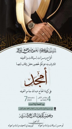 تحتفل عائلة آل عجيان والمضري في حلة محيش مساء يوم الجمعة بعقد قران الشاب كاظم فيصل ابراهيم آل عجيان على كريمة الحاج حبيب مهدي المضري وسط فرحة الأهل والأصدقاء ومحبي العريسين. أسرة ”جهينة الإخبارية“ تهنئ العريسين وعائلتيهما وتسأل الله ان يبارك لهما، متمنين لهما حياة سعيدة ‏ ...