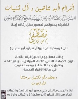 تحتفل عائلة أبو شاهين وآل ثنيان في القديح مساء يوم الإثنين بزفاف الشاب مصطفى علي حسن أبو شاهين على كريمة الحاج ميرزا آل ثنيان «أبو سلمان» في صالة الأقمار الخمسة وسط فرحة الأهل والأصدقاء ومحبي العريسين. وعبر العريس عن سعادته الغامرة بدخوله القفص الذهبي، سائلا الله أن يوفقه وعروسه ويرزقهما الذرية الصالحة. أسرة ”جهينة الإخبارية“ تهنئ العريسين وعائلتيهما وتسأل الله ان يبارك لهما، متمنين لهما حياة سعيدة ‏ ...